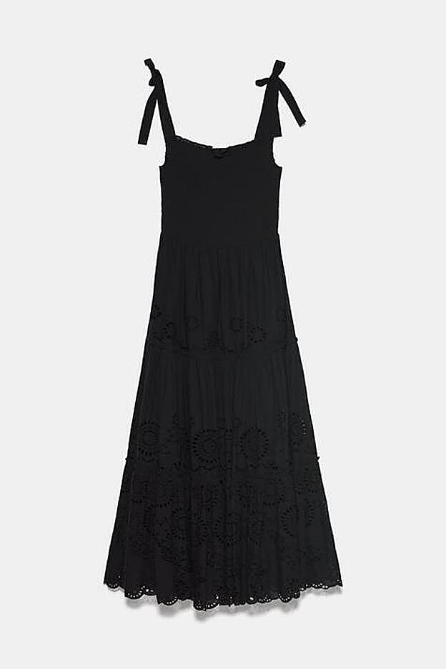 Uno de los últimos en llegar a las tiendas ha sido este vestido de Zara en diseño midi con tirantes anchos con lazo. Con escote recto y elástico tipo nido de abeja en la parte superior, tiene el bajo acabado en volantes con bordados perforados combinados a tono. Cuesta 39,95 euros y está disponible entre las tallas XS y XL.