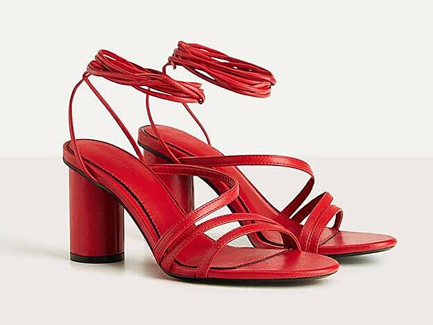 Añade a tus looks básicos de verano unas sandalia como estas de tacón ancho cilíndrico en color rojo y atadas al tobillo (19,99 euros).