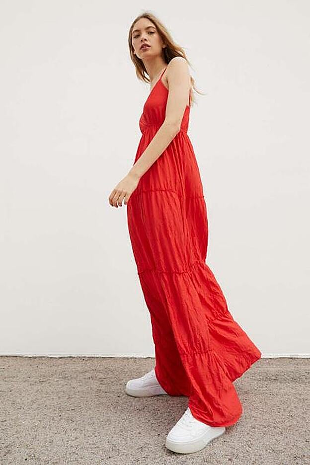 En tu armario de verano no puede faltar un vestido largo como este rojo de tirantes, escote en pico cruzado y ceñido debajo de pechera de Bershka. Cuesta 19,99 euros y es perfecto hastas para llevar con zapatillas.