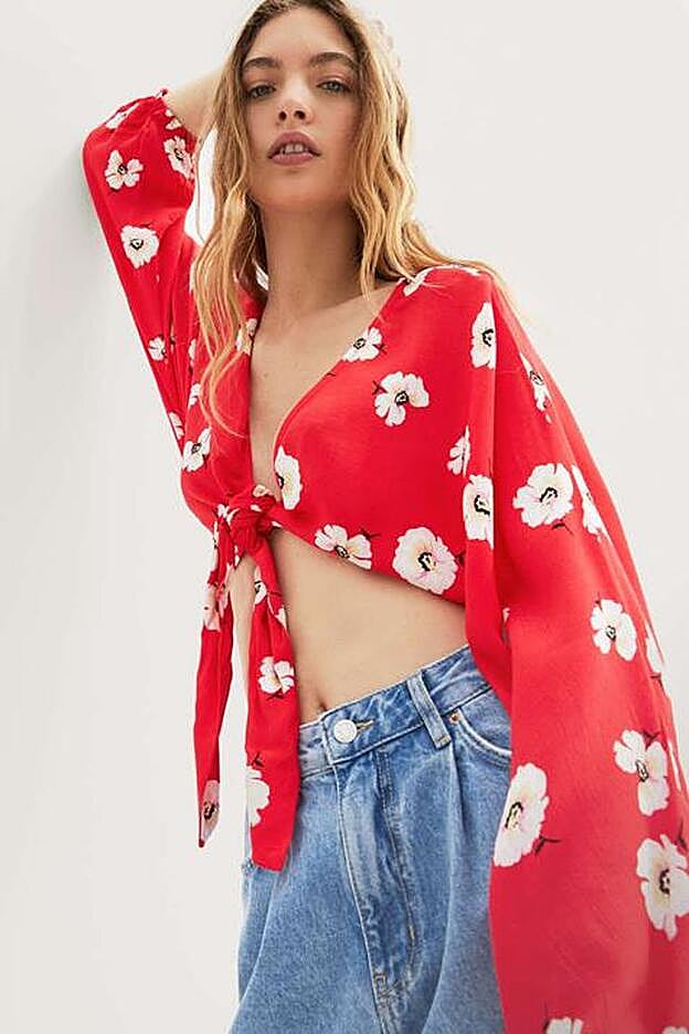 Blusa cropped con nudo en el escote y mangas acampanadas. Cuesta 17,99 euros y es ideal para combinar con pantalones vaqueros azules o en color blanco..