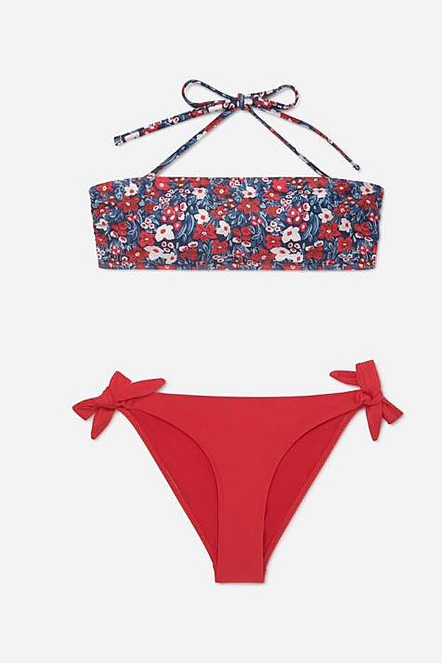 Nuestro favorito es el que une tonos rojos y azules, con la parte superior con flores que también incluyen el blanco y una braguita roja con los laterales acabados en lazo. Cuesta 4,99 euros y está disponible entre las tallas S y XL.