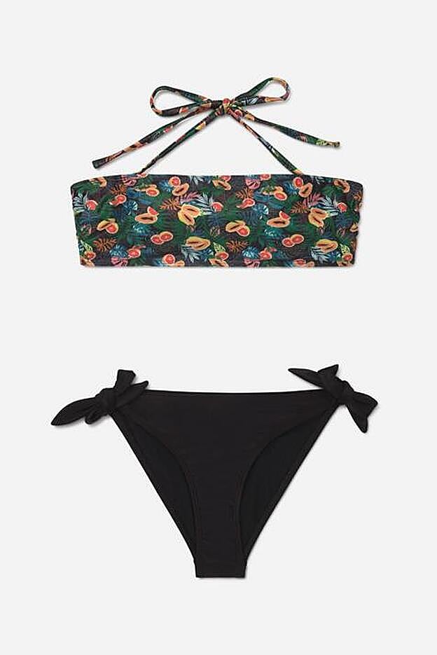 La tercera propuesta de Lefties tiene aires más tropicales y en la parte superior combina el verde y el naranja teja con frutas tropicales como la papaya o la granada. La braguita viene en color negro, también tiene los laterales acabados en lazos y cuesta 4,99 euros. Está disponible entre las tallas S y XL.