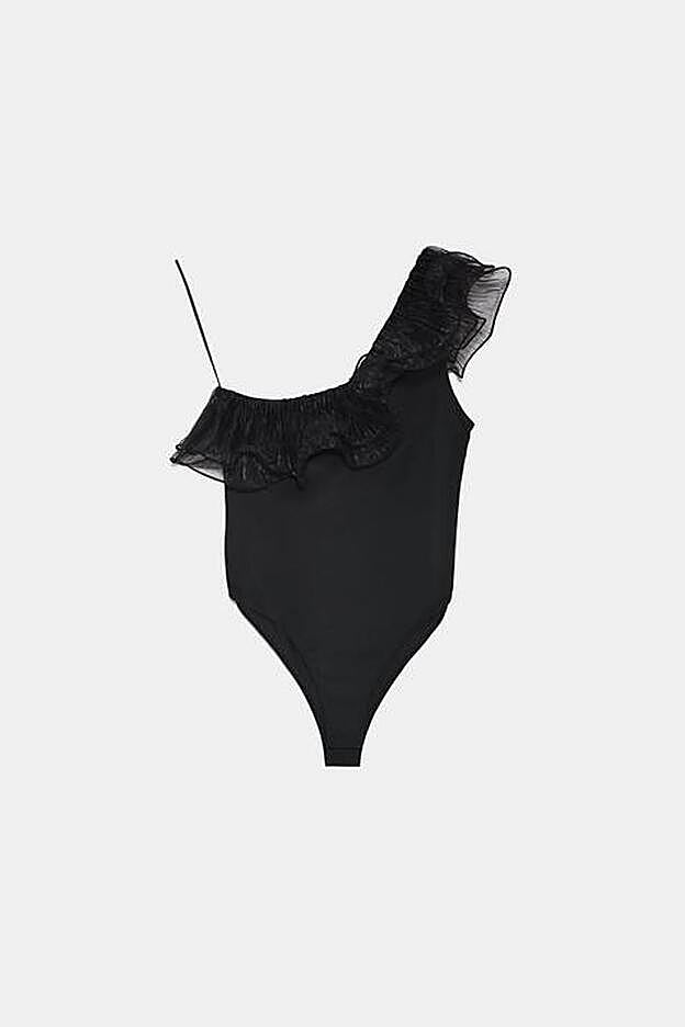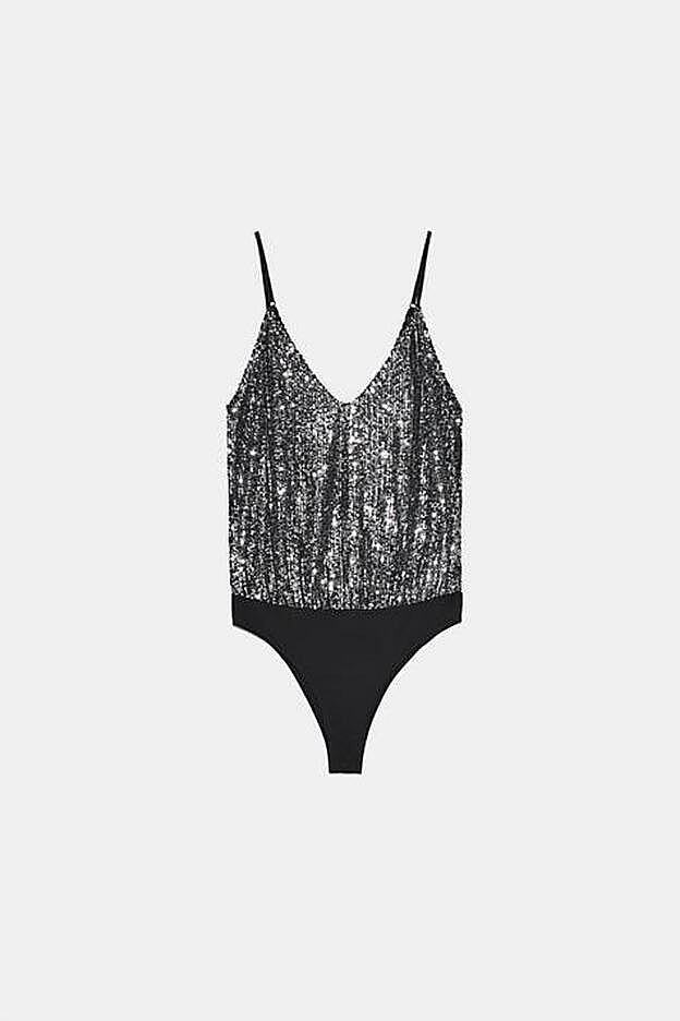 Para los momentos de fiesta Zara ha lanzado un body de escote asimétrico con volante combinado a tono en organza. Cuesta 17,95 euros y está disponible en las tallas S, M y L. Pero si lo nuestro son las lentejuelas, tenemos un body con escote de pico y tirantes finos con aplicaciones de lentejuelas en la parte superior de la prenda. Tiene el mismo precio que el anterior, y está disponible entre las tallas S y XL.