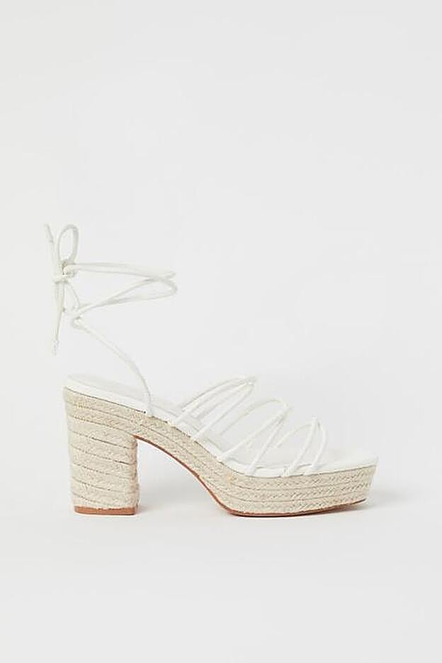El primero modelo que ha captado nuestra atención ha sido este: es absolutamente ideal. Con palataforma, tacón cuadrado (seguro que son comodisímas), tiras en color blanco y anudadas al tobillo, son perfectas para llevar con vestidos mini o faldas de vuelo. Cuestan 39,99 euros.