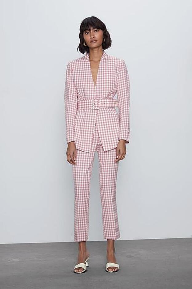 La ex concursante de Supervivientes publicó una imagen en su cuenta de Instagram en la que aparece con un traje muy original. Se trata de un dos piezas de cuadros vichy rosa y blanco de Zara, que está formado por una americana y un pantalón. Una blazer que con un diseño muy especial ya que no tiene solapas formando un escote en pico pronunciado muy sexy y viene acompañada de un cinturón a juego con hebilla. Cuesta 49,95 euros y es tiene el pantalón a juego.