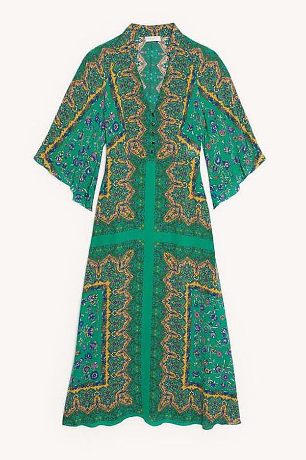 En la web de la firma hay disponible un modelo tipo kimono con un estampado similar por si tú también te has quedado con las ganas de tenerlo. Cuesta 325 euros y también es de corte midi, escote en pico y está protagonizado por sus tonalidades verdes. ¡Ideal!