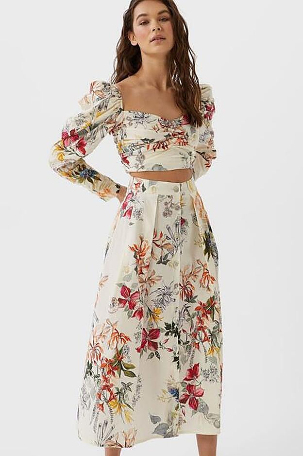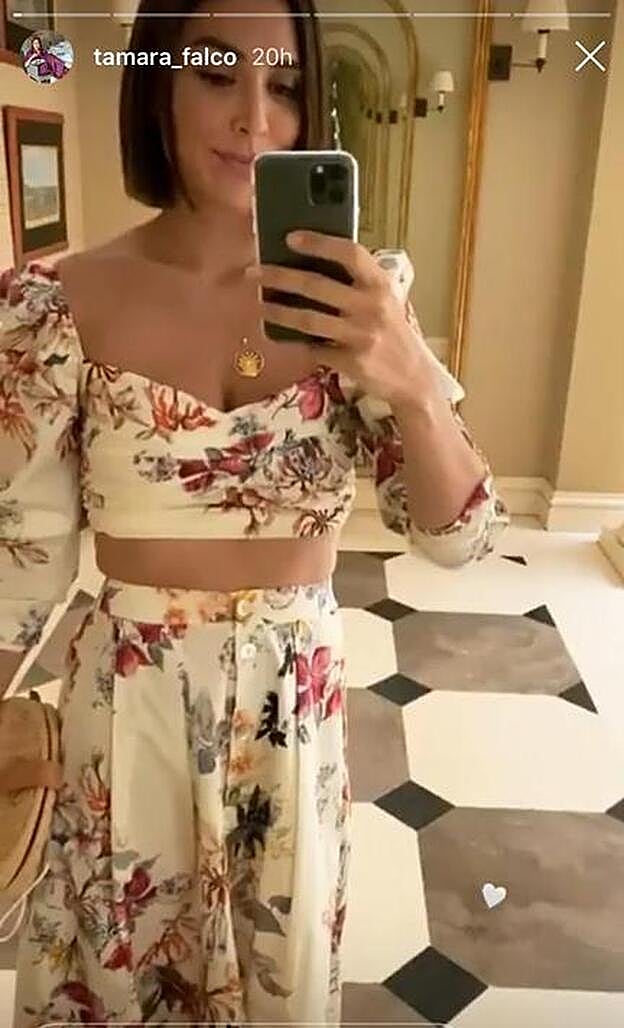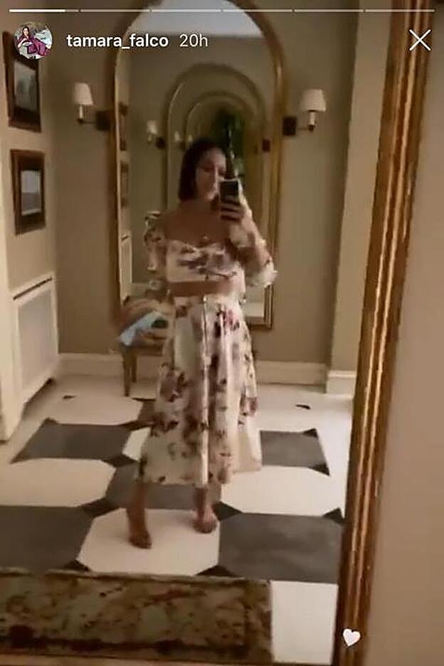 Y es que Tamara lucía un conjunto en color beige con flores en diferentes tonos formado por una falda midi con cierre frontal con botones y corte acampanado que cuesta 25,99 euros. Un modelo muy favorecedor que forma parte de la nueva colección de Stradivarius y que tiene su top cropped a juego. Un diseño de manga larga abullonada y escote en forma de corazón ideal. En el vídeo que subió Tamara se puede apreciar que lo combinó con unas sandalias finas y un 'clutch' y su melena lisa, demostrando que puede ser una opción perfecta como look de invitada. ¡Nos encanta!