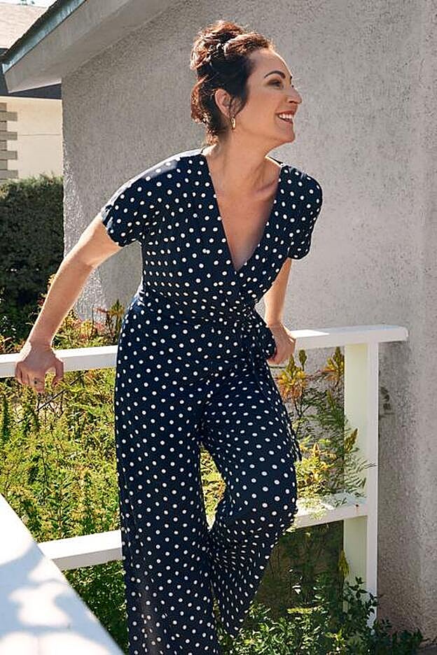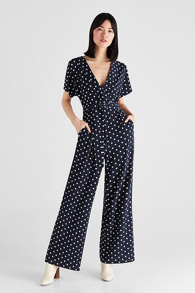 Ana Milán posó en varias ocasiones para la campaña de Cortefiel con esta prenda tan ideal. Se trata de un mono largo y de manga corta con un favorecedor escote cruzado y en pico y ceñido a la cintura gracias a un cinturón lanzada a juego. El cuello tiene unas originales solapas tipo esmoquin que le dan ese toque más elegante que se completa gracias a la pernera ancha. Es en color azul marino con lunares blancos, uno de los estampados más buscados y más tendencia de la temporada.