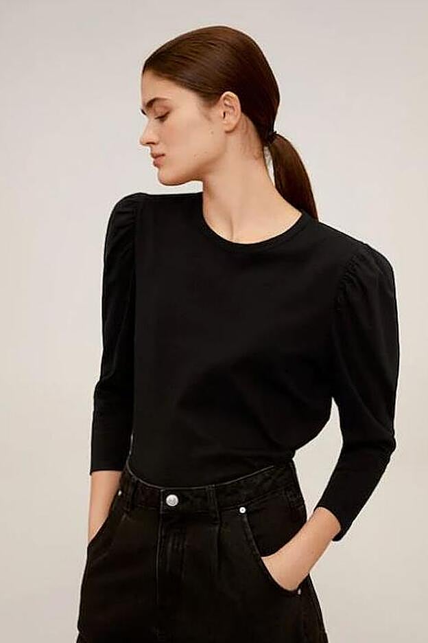 Nuria lució una falda midi plisada ideal de estampados geométricos en tonos azules, rojos y verdes de ANONYME designers. Un diseño que se llevaba todo el protagonismo del estilismo, por lo que la escritora optó por añadir como parte de arriba una prenda negra. En concreto una blusa de manga larga con mangas abullonadas de Mango y que hemos encontrado en sus rebajas. Una camiseta con el mismo diseño que la que ha llevado Nuria Roca, que costaba 9,99 euors y que ahora puedes encontrar por 5,99 euros. Chollazo, ¿verdad?