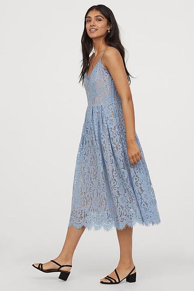 En dicha imagen, Tamara luce un vestido midi de tirantes en color azul pastel. Un diseño protagonizado por un tejido de encaje que daba a la prenda un toque diferente y muy elegante. Este tipo de tela es perfecto para eventos de este tipo y unas de las tendencias de la temporada. Y aunque no sabemos dónde ha comprado Tamara el vestido, en H&M hemos encontrado uno muy similar.
