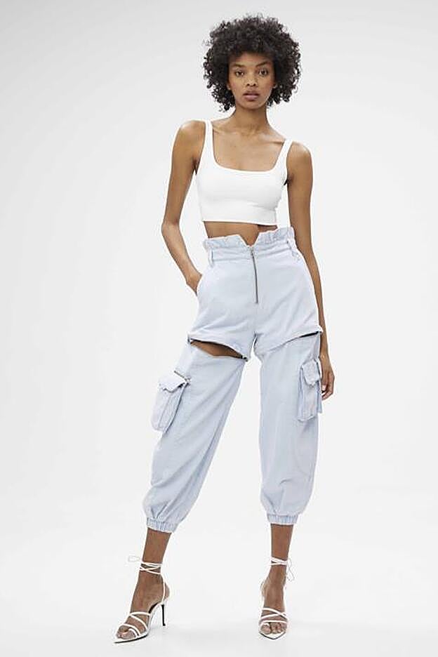 Sí, has leído bien: un pantalón desmontable. Se trata de unos jeans de corte jogger y estilo cargo en azul clarito de talle alto con un cintura paper bag. Un modelo muy cómodo y muy favorecedor que lleva una cremallera a mitad del muslo para poder deshacerte de parte de la pernera y obtener un short muy veraniego. Lo más, ¿verdad? La prenda cuesta 45,99 euros, está disponible en la talla XS, S y M y la puedes comprar aquí.