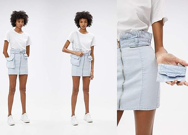 Además, en esta colección denim que ha sacado la firma de Indotex, también se encuentra una minifalda con elementos desmontabbles, de la que puedes sacar un monedero o un bolso tipo bandolera. Es un diseño en el mismo tono del vaquero que lleva unos bolsillos cargo extraíbles y un cinturón con el que puedes crear el asa de tu bolso. ¡Nos encanta! Cuesta 29,99 euros y la puedes comprar aquí.