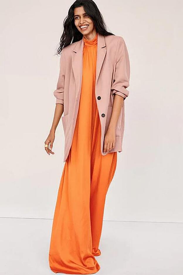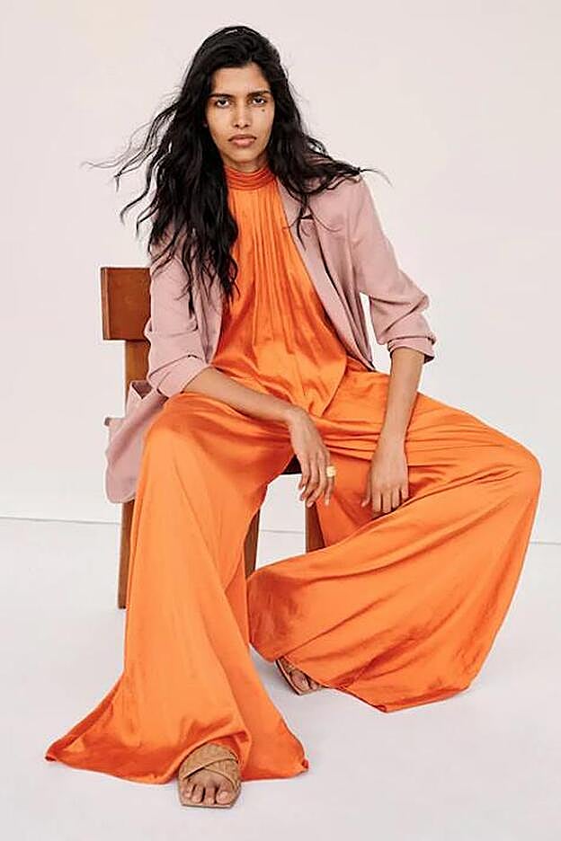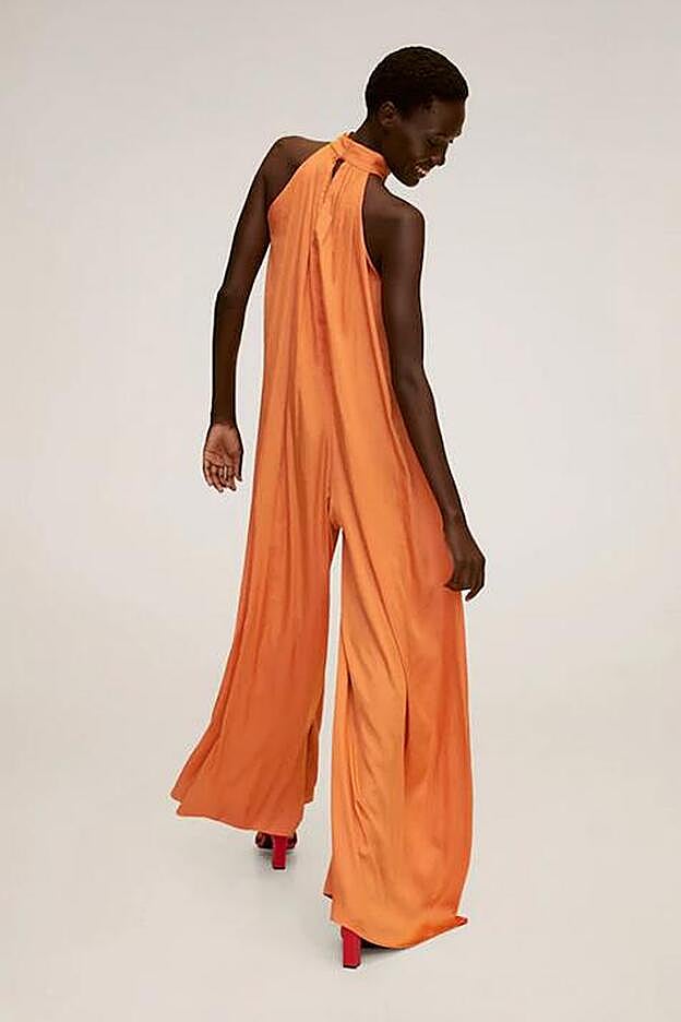 Con diseño largo y acampanado, en un vistoso color naranja satinado, este mono de Mango tiene cierre de lágrima en la espalda. Una propuesta cómoda y elegante que puede parecer un vestido, pero que nos ofrece la comodidad de las perneras de un mono.