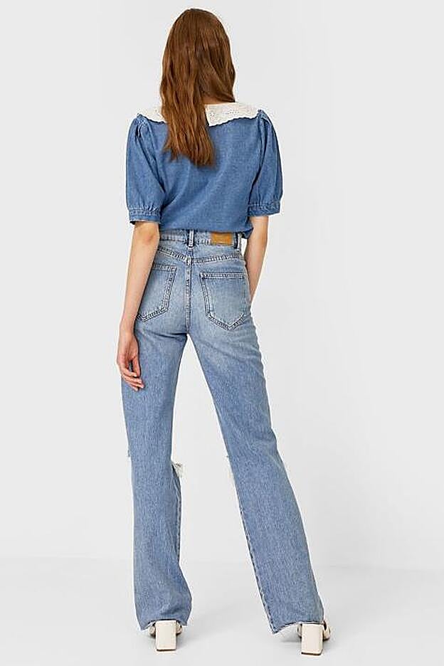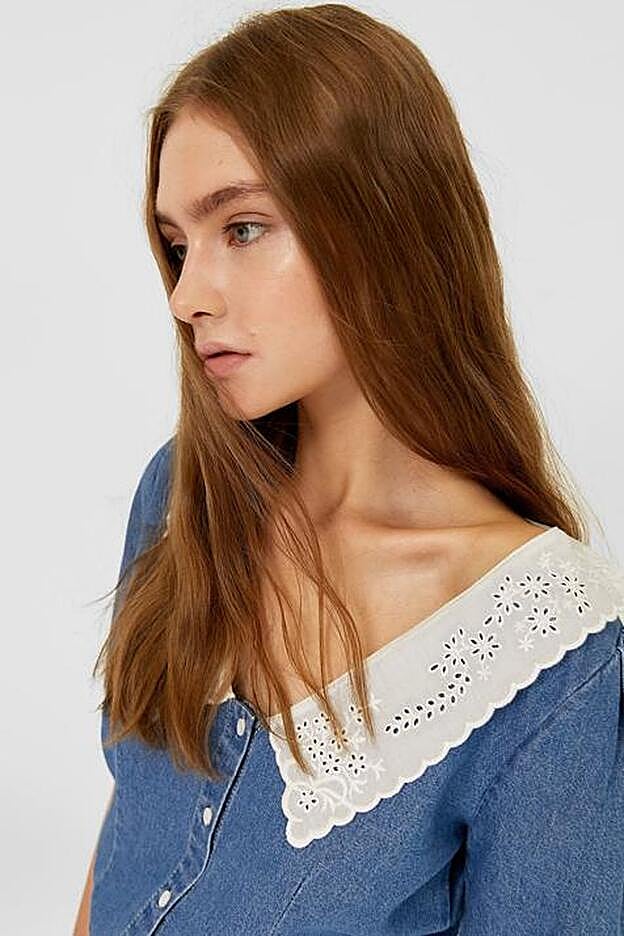 Con bordes redondeados y solapas con bordado inglés, la firma de Inditex ha llevado el cuello bobo a una camisa tejana de manga corta abullonada. Una creación cargada de aires románticos que tiene un precio de 19,99 euros y está disponible en las tallas S, M y L.