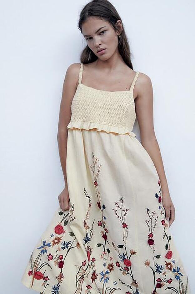 Otra de las propuestas de Zara en color crudo es este vestido confeccionado con tejido en mezcla de algodón y lino. Con escote recto elástico y tirantes finos, es de diseño largo y la falda tiene detalle de bordados florales combinados a contraste. Cuesta 49,95 euros y está disponible en las tallas S, M y L.