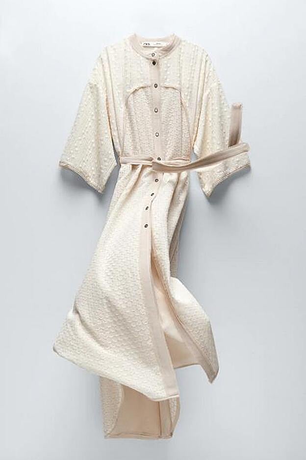 En color crudo, este vestido de cuello redondo y manga amplia por debajo del codo viene con vivos combinados a contraste, cinturón lazada en tejido combinado y bajo con aberturas laterales. Con cierre delantero con botones tiene un precio de 79,95 euros y se ha agotado en todas las tallas, aunque regresará a la web en las tallas S y M.