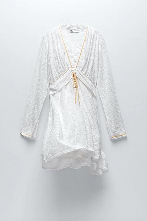 Nuestro favorito es este vestido blanco de bordados perforados con escote de pico y manga larga acabada en abertura. Con bolsillos laterales ocultos en costura y forro interior, este bonito vestido viene con lazada combinada de terciopelo en color vainilla y detalle de frunce delantero. Tiene un precio de 59,95 euros y está disponible entre las tallas XS y L.