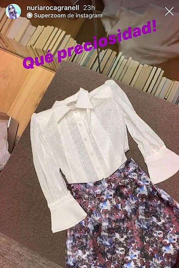 Y es que enseñó una falda de corte midi con un estampado floral en tonos granates y azules con efecto difuminado y de un tejido brillante. Un diseño que a priori parece perfecto para llevar en una evento, pero que como dijo Nuria, "no hace falta ir a una boda para verstirla". De hecho, la escritora recibió la falda junto a una camisa blanca con bordados perforados que, añadiendo unos sandalias planas o incluso unos botines en otoño, se convierte en un look súper ponible.