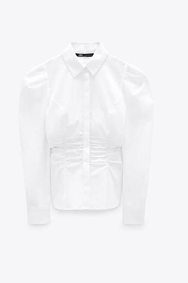 Con las mangas abullonadas y un delicado fruncido en la parte del abdomen, esta camisa blanca, (25,95 euros) es perfecta no solo para combinar con pantalón vaqueros, sino también con faldas o incluso debajo de vestidos satinados.