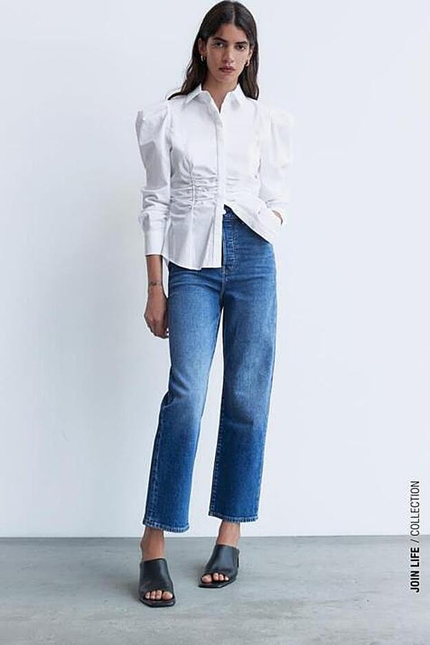 Buceando en la web, salta a la vista que es una de las propuestas que más se repiten para el otoño. Y tras mucho buscar, una ha sido la elegida: un vaquero sencillo de talle alto y una camisa blanca con un toque vintage y fruncidos que se convertirá en la prenda favorita de tu armario.