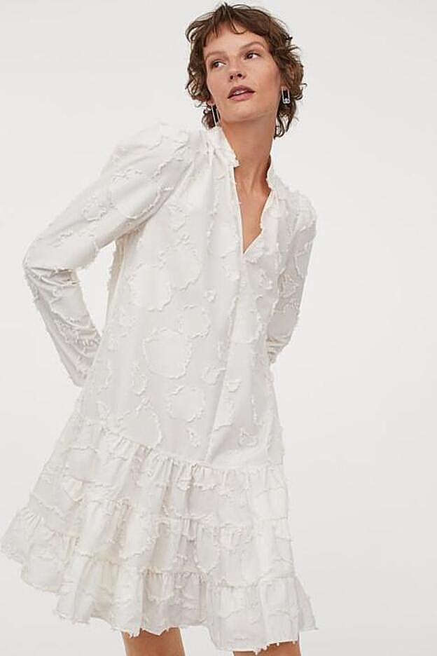 Se trata de un vestido evasé corto en tejido jacquard de poliéster reciclado. Es de color blanco y tiene un diseño de manga larga muy acertado para estas temperaturas más bajas. Es de cuello elevado de doble capa con pliegues, escote en pico y posee un fruncido escalonado en la falda para dar volumen. ¿Lo mejor? Los 19,99 euros que cuesta y que forma parte de la colección Concious de la firma, es decir, que está creado a partir de materiales reciclados y deshechos textiles.