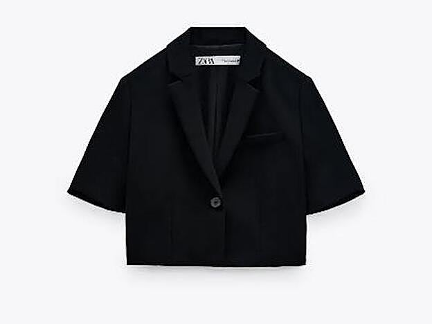 Se trata de un modelo cropped, tendencia la temporada pasada y parece que esta seguirá llevándose, en color negro y de manga corta. Original, ¿verdad? Y aunque Nagore la llevó con una camiseta básica y una minifalda estampada, es perfecta para añadirla a tus jeans de talle alto y acentuar el corte en la cintura y su efecto estilizador. Lo mejor es que su color negro combina a la perfección con todo y también es ideal para usarla con minivestidos ahora en el entretiempo.