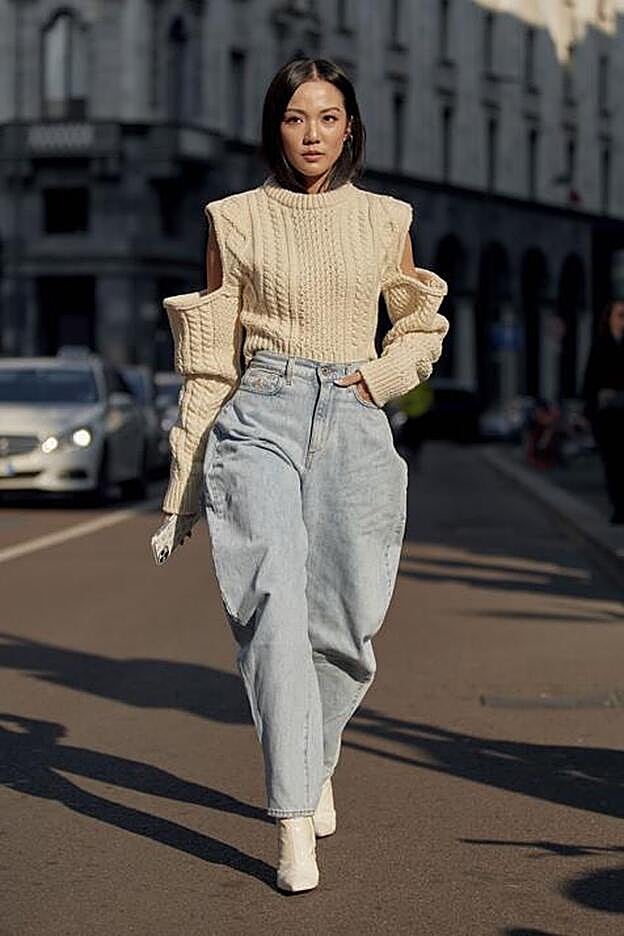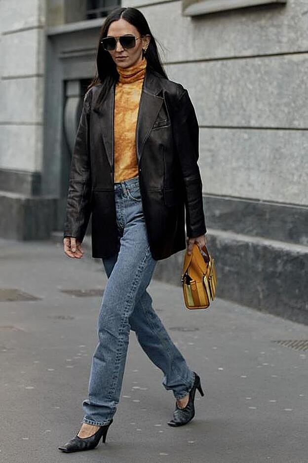 Resucitando una de las tendencias que más atención capta este otoño (la estética noventera), las alternativas para lucir el vaquero de talle alto contemplan recurrir a una americana confeccionada en tejido de efecto piel y una nota de color atrevida gracias a un jersey elástico de cuello alto.