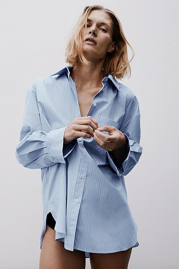 Otro clásico de las camisas es el azul claro y Zara lo ha llevado a esta camisa con bolsillo de plastrón en delantero, cierre frontal con botones a tono y cuello de solapa. Con mangas acabadas en puño, podemos encontrarla entre las tallas XS y XL por 29,95 euros.