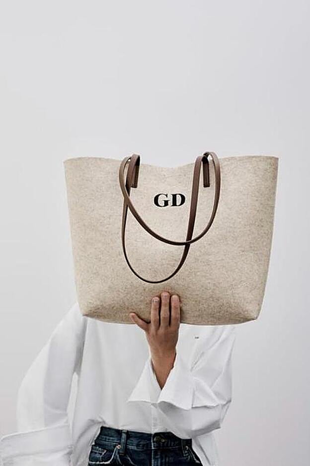 Con las pretensiones de un Goyard o un Vuitton personalizado, pero a un precio baratísimo incluso para Zara, si lo comparamos con el resto de bolsos de su nueva colección, este ‘tote bag’ permite estampar tus iniciales bordadas (dos, nada más) en diferentes colores por solo 3 euros para “transformar tu bolso de fieltro en una pieza única”.