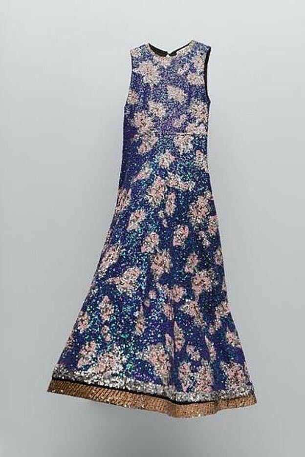 Hablamos de un vestido de largo midi de punto repleto de apliques de lentejuelas por toda la prenda. Unos adornos que forman un estampado floral en color rosa muy clarito sobre un fondo azul oscurocon detalles dorados. Tiene un diseño muy simple con cuello redondo, sin mangas y falda acampanada apto para cualquier tipo de siluetas y que deja todo el protagonismo a los brillos. Además, tiene una apertura en la espalda que consigue un efecto sexy y sugerente, pero sin perder la elegancia de la prenda.