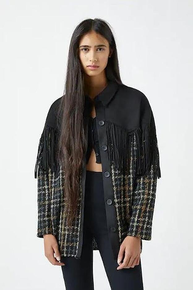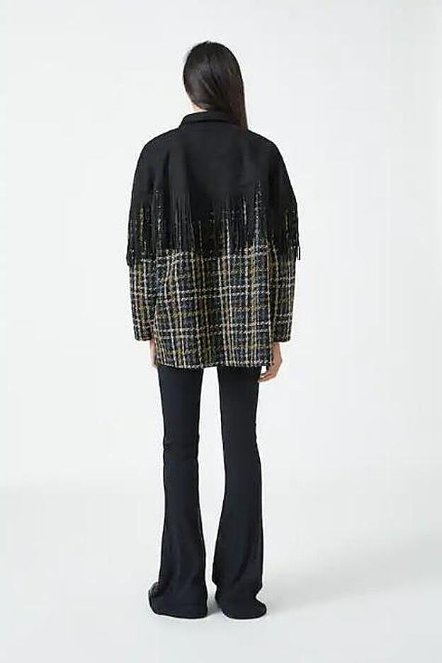Se trata de una distinta y que no hay en otras tiendas porque es un modelo combinado en dos tejidos que une dos de las tendencias de la temporada: los cuadros y los flecos. Es una sobrecamisa que tiene la parte inferior en un tejido tweed que forma un estampado de cuadros en tonos neutros como beige, blanco y negro. En la parte de los hombros y el cuello, esta sobrecamisa es negra de ante con unos flecos que caen hasta la mitad de la prenda que le dan movimiento y un punto sofisticado que nos encanta.