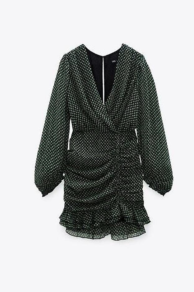 Nagore ha vuelto a recurrir a la fórmula de vestido mini con botas que tanto triunfa últimamente y que parece que es su favorita. Y lo ha hecho con un vestido ideal que tú también se lo vas a querer copiar. Se trata de un vestido con escote pico cruzado y manga larga que tiene la falda drapeada con el bajo acabado con frunces y volantes. Además, está caracterizado por un estampado en color verde y crudo con hilo metalizado que favorece muchísimo.