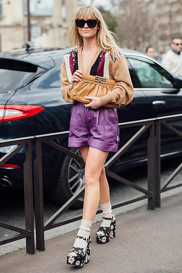 Si hay un tejido que sigue manteniéndose en lo más alto del podio como el emblema de la rebeldía, ese es el cuero. Desde un ángulo juvenil y muy favorecedor, los shorts de piel en colores llamativos se mezclan con rebecas de punto tejidas en grecas y sandalias de plataforma con calcetines.