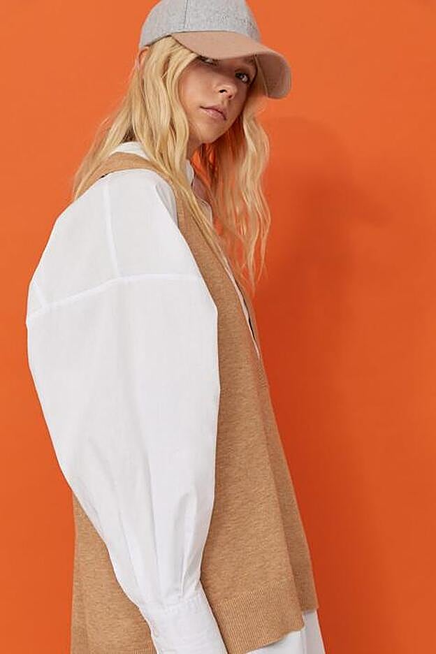 Aunque utilizarla como vestido también es una de las opciones, conviene no olvidar la faceta más desenfadada de la camisa, que se puede llevar con un chaleco también oversize para potenciar la inspiración masculina, dejando que las mangas se lleven todo el protagonismo y permitiendo que sobresalga por debajo.