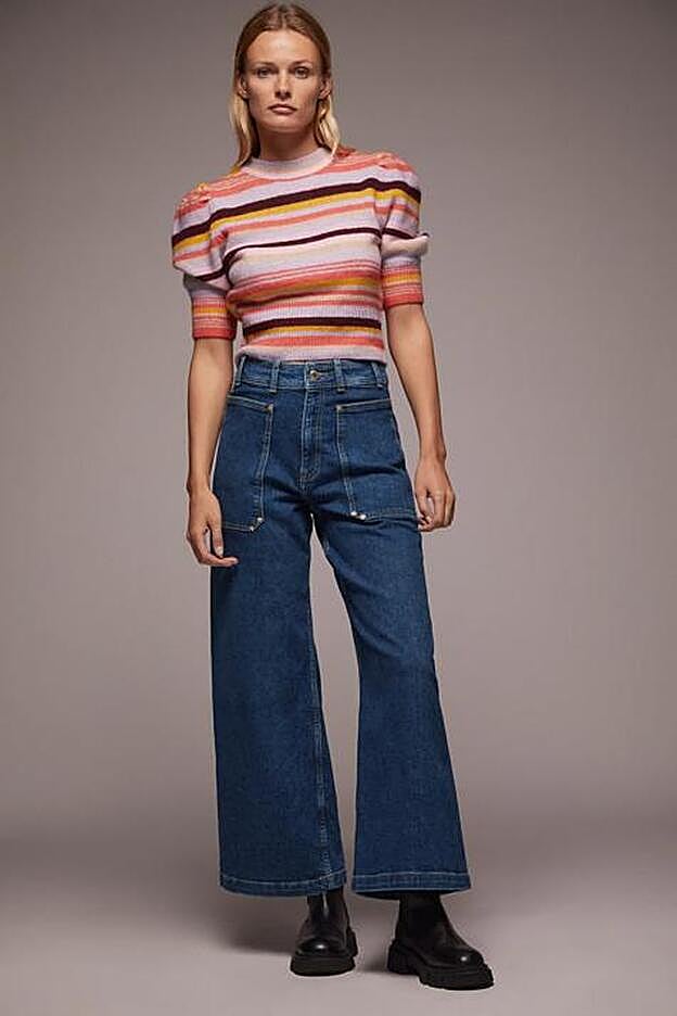 Se trata de un suéter de silueta ligeramente 'cropped' con estampado multicolor de rayas horizontales (¡pongamos color a los días grises del otoño-invierno!) y favorecedoras mangas 'puffy', una de las tendencias de la temporada. Y como luce Tamara Falcó, será el complemento perfecto para tus vaqueros favoritos: sienta de maravilla con unos jeans de talle alto, ya que con su cintura alta y marcada harán que esta parezca más delgada. Además, el volumen de las mangas del jersey equilibrará y estilizará tu silueta.