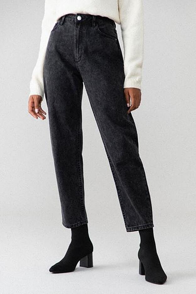 Rocío optó por dar todo el protagonismo al abrigo y lo combinó con prendas básicas de colores neutros. Escogió unos jeans de corte mom fit en color negro. Un modelo de talle alto y pernera recta de lo más favorecedor, que sienta de maravilla y que puedes encontrar en la web de la firma por 17,99 euros.