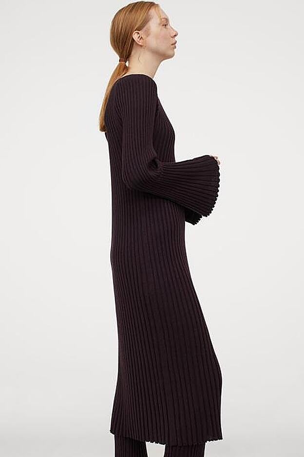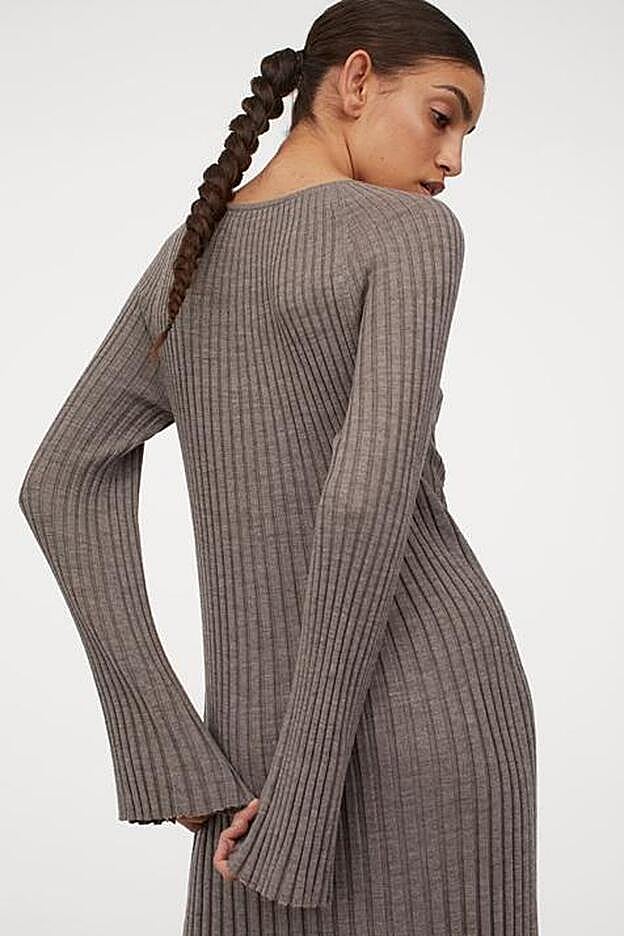 De diseño midi en punto de canalé de lana de merino suave, este vestido de H&M viene con cuello suave redondo y mangas largas con diseño trompeta, una apuesta muy favorecedora que contribuye al efecto estilizador de la prenda.