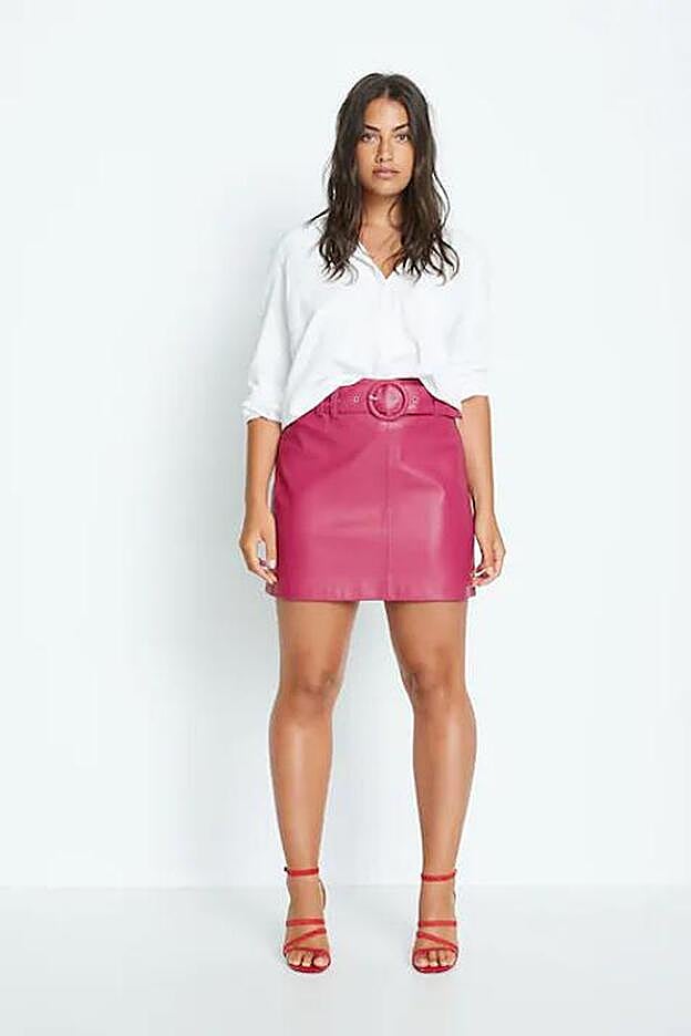 Violeta, la línea 'curvy' de Mango, ha lanzado una minifalda efecto piel (una de las tendencias de la temporada) en un irresistible rosa fucsia que ya se ha convertido en una de nuestras obsesiones de este otoño-invierno. Con cinturón incorporado a juego y largo por encima de la rodilla, cuesta 39.99 euros, está disponible también en negro (aunque no nos gusta ni la mitad que en rosa) y de la talla S a la XXL, aunque en esta última, está agotada (pero, tranquila, con lista de espera). Por algo será...