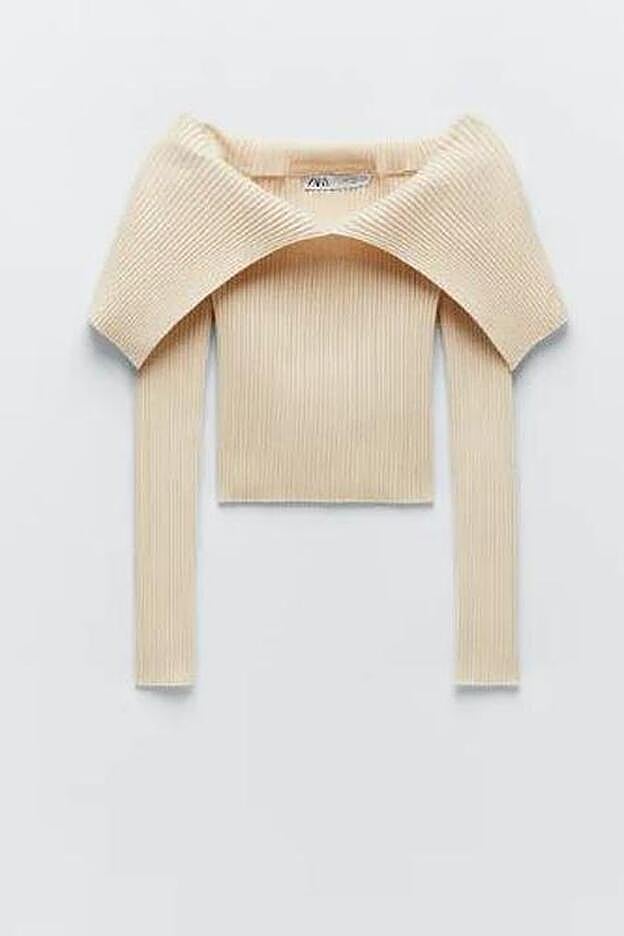 Se trata de un top de punto de canalé en color crudo que lleva el escote en barco y una especie de volante que cae por encima de los hombros y que simula un escote en pico. Es un cuerpo cropped que cuesta 25,95 euros y que está disponible también negro.