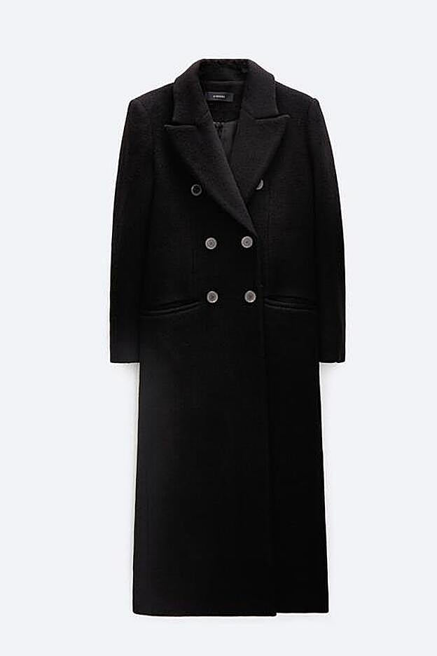 1. Abrigo negro de Uterqüe confeccionado con tejido de lana italiana para la colección cápsula IN/OUT. Cuello con solapa, hombreras marcadas, bolsillos delanteros, botones cruzados y diseño largo ligeramente oversize. Llévalo con vaqueros, con pantalones de traje, con vestidos, con faldas, con monos (como este vaquero que triunfa en Instagram) y con todo tipo de calzado. En la web de Uterqüe está rebajado a 171,75 euros y está disponible desde la talla S a la L.
