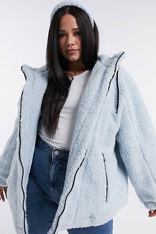 La opción para las tallas grandes no es un abrigo ni un chaquetón, pues vamos buscando una silueta lo más escueta posible, para que la textura voluminosa del peluche no se alargue demasiado. Asos Design Curve tiene una chaqueta 'bomber' en peluche azul cielo que es una preciosidad: la silueta es holgada, lleva cuello alto y capucha con cordón ajustable y cierra con cremallera (77,99 euros).