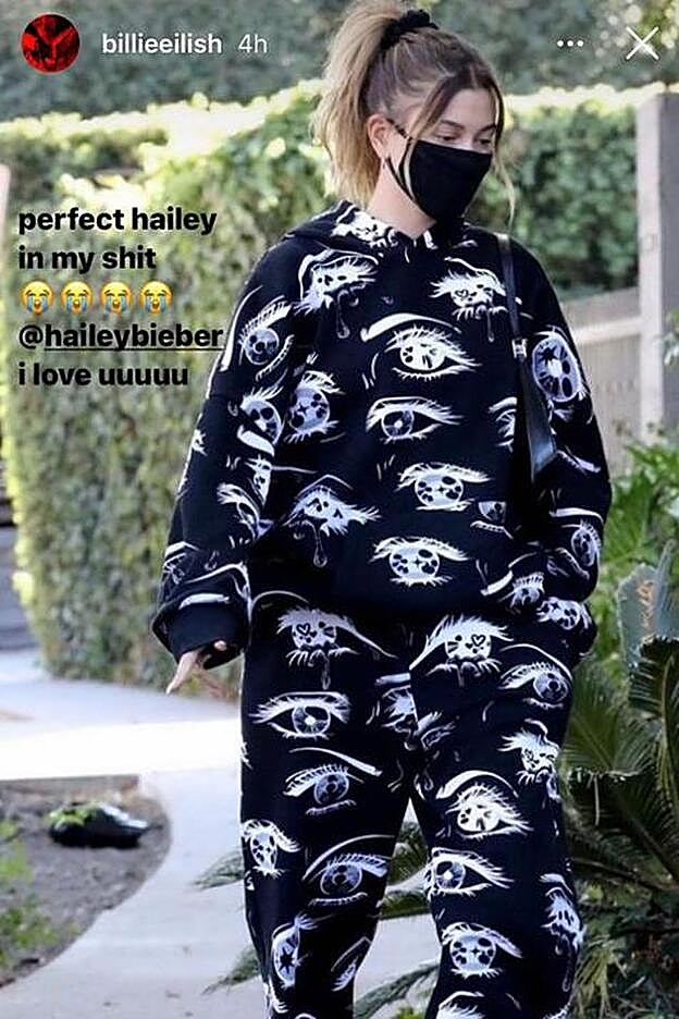 Original, ¿verdad? Hailey Bieber lo combinó con unas zapatillas Nike en color blanco, negro y amarillo y calcetines blancos. No faltó tampoco su mascarilla en color negro que completaba un look que ha gustado mucho a sus seguidores y la propia Billie Eilish. La cantante se ha mostrado muy orgullosa de que la modelo lleve este conjunto de su colección y ha compartido una imagen de la mujer de Justin Bieber con el siguiente texto: "La perfecta Hailey con mi mierda. Te quiero".