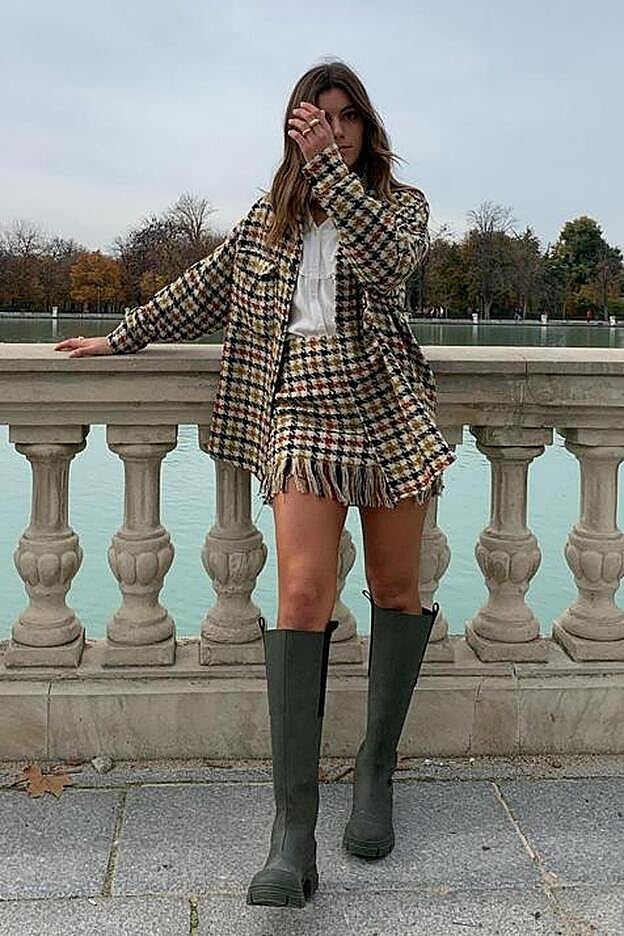 La falda es un modelo mini del mismo tejido y estampado que lleva el bajo desflecado siendo un diseño ideal y muy original, que muy a nuestro pesar, está desaparecida en la web de la firma. Y todo indica que ya se ha agotado. Aunque si tienes la posibilidad de encontrarla en tienda, no dejes desaprovechar la oportunidad porque puedes conseguir lookazos como este de la influencers. Que ha optado por combinarlo con las botas verde militar de goma virales que hay en Zara.