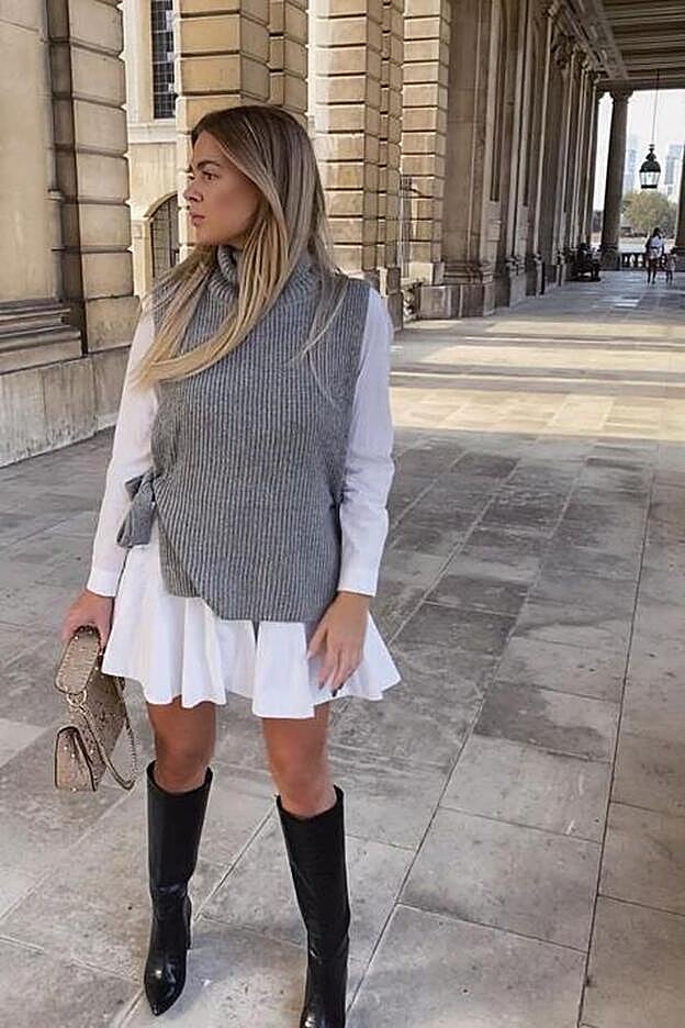 Su falda mini y la unión con el calzado imprescindible para esta temporada, las botas, nos ayudan a conseguir un look impecable lleno de estilo. A la hora de escoger el chaleco tenemos multitud de opciones en los colores tendencia de la temporada, el gris, el beige o el negro.