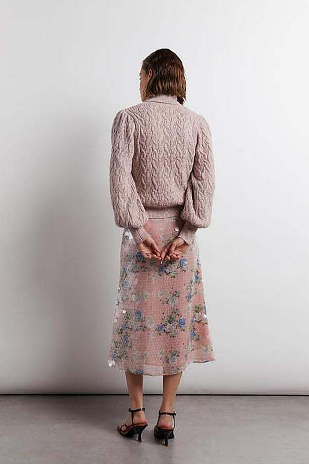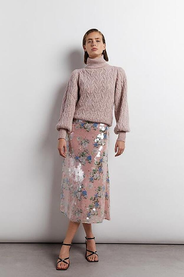 Los colores empolvados de las lentejuelas y el corte midi la hacen perfecta para cualquier look casual, y combinada con un jersey de punto grueso, es tan efectista como infalible.