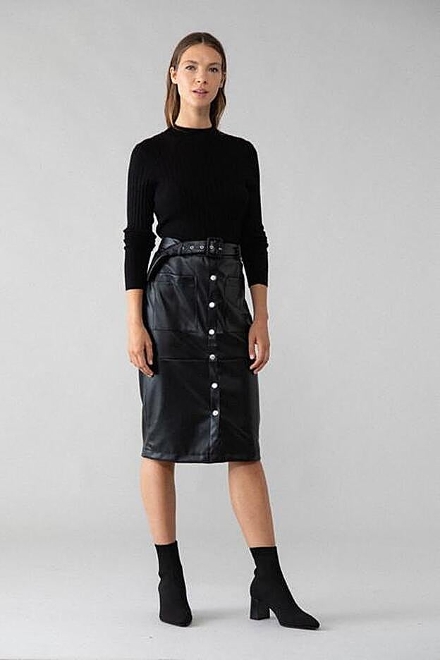 La opción más calentita gracias a su forro interior: la falda midi de efecto piel. Lefties propone una versión con cierre de botones, tiro alto, bolsillos delanteros y cinturón ajustable para presumir de figura. Su color negro es tan versátil que querrás llevarla con todo durante los siete días de la semana. Cuesta 19,99 euros y está disponible en todas las tallas de la XS a la XL.