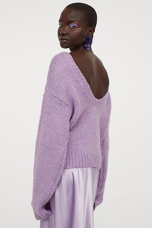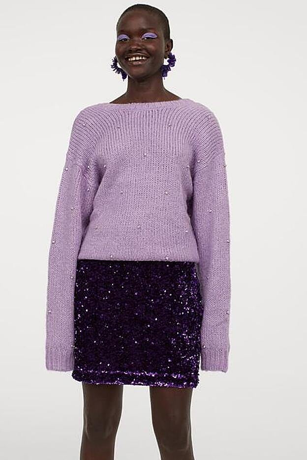 Para acompañar ambas faldas es ideal este jersey de punto suave con lana en la trama y aplicaciones de plástico en plata redondeadas. Con cuello redondo y escote profundo en la espalda, tiene diseño de hombros caídos y mangas amplias. Podemos encontrarlo entre las tallas XS y XXL por 29,99 euros.