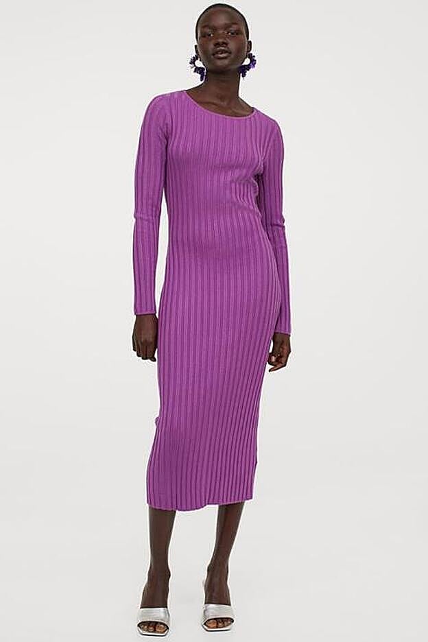 Diseño midi en punto de canalé para este vestido entallado con escote de barco y sección cut-out en la espalda con detalle girado. Está disponible entre las tallas XS y XL por 34,99 euros.