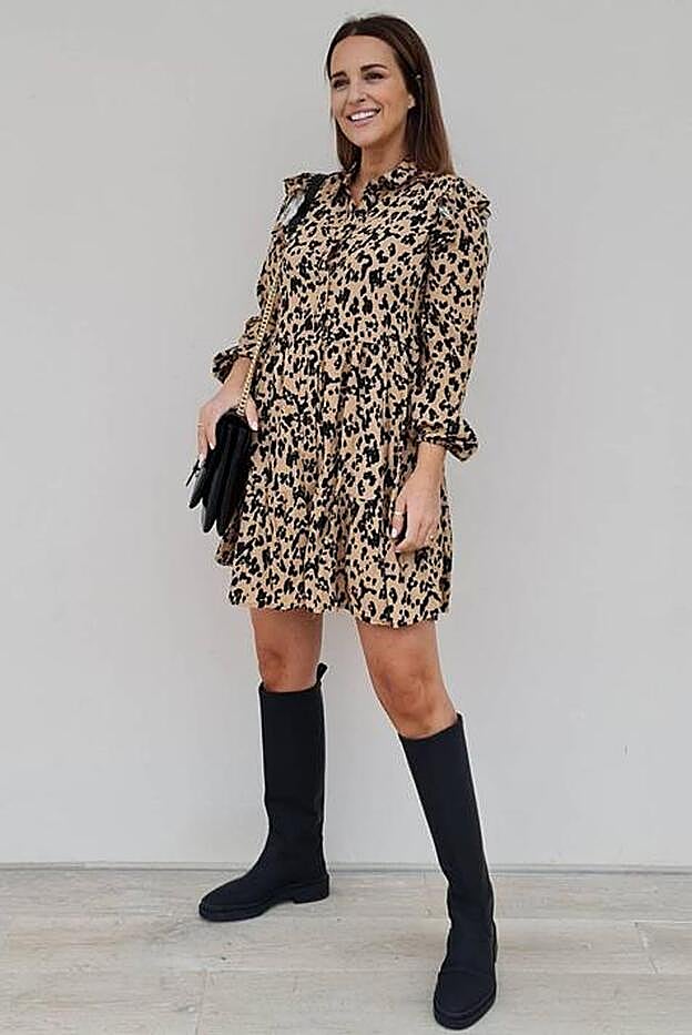 Paula escogió el diseño que hay con estampado de leopardo en color beige y negro, demostrando que es un vestido perfecto para las premamás ya que es cómodo por su tejido elástico y fluido, pero también para las que prefieren disimularlo todo.