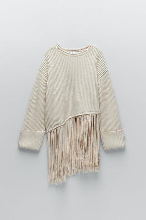 Se trata de un jersey de punto oversize de manga larga, con bajo asimétrico y acabado con flecos. La fusión perfecta entre la paleta de colores minimalista y la corriente folk imperante desde las pasarelas.